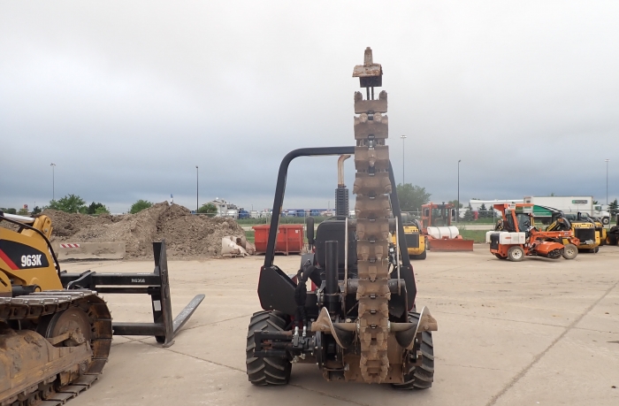 Canopy, Cummin 3.3B 65HP diesel, 2 speed, 4 wheel steer, 31x15.50-15 tires, 60" trench depth, 8" wide carbide rock teeth, crumber, hydraulic side shift, 6-way 6' blade, front weights, 8,500 lbs. (Stock #11235)