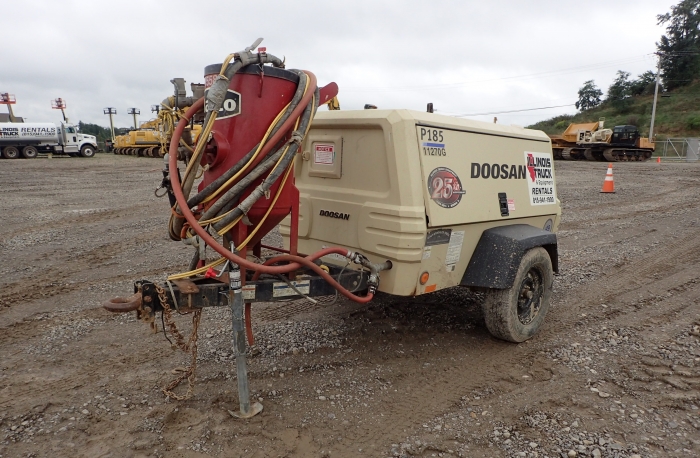 RENTAL UNIT ONLY - CALL FOR RENTAL RATES. Doosan D24NAP 49HP Tier 4f diesel, 185 CFM, 100 psi, 215/75/D15 tires, pintle hook, 27 gallon fuel tank, 10 hr. run time, 2,450 lbs. (Stock #11270)