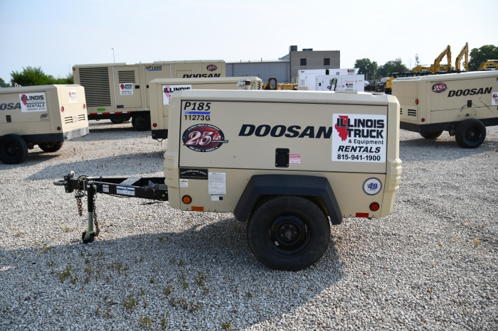 RENTAL UNIT ONLY - CALL FOR RENTAL RATES. Doosan D24NAP 49HP Tier 4f diesel, 185 CFM, 100 PSI, 215/75/D15 tires, pintle hook, 27 gallon fuel tank, 10 hr. run time, 2,450 lbs. (Stock #11273)