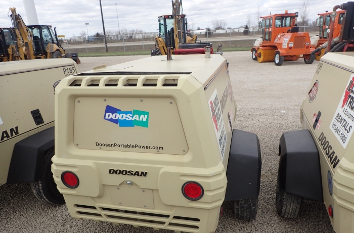 RENTAL UNIT ONLY - CALL FOR RENTAL RATES. Doosan D24NAP 49HP Tier 4f diesel, 185 CFM, 100 psi, 215/75/D15 tires, pintle hook, 27 gallon fuel tank, 10 hr. run time, 2,450 lbs. (Stock #11275)