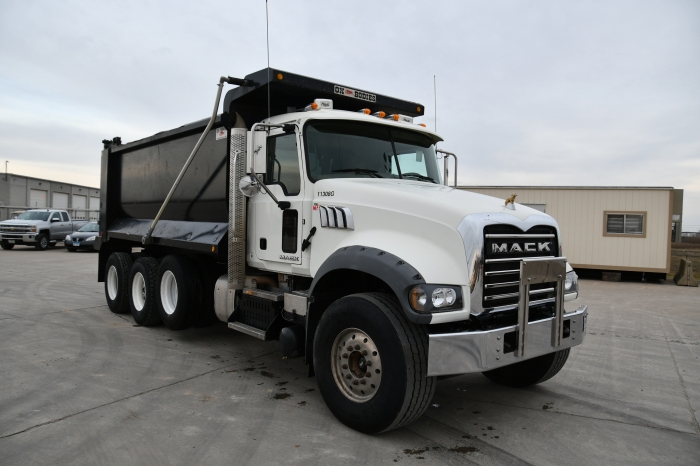 RENTAL UNIT ONLY - CALL FOR RENTAL RATES. Mack MP-8 445HP T4f diesel, Mack 10 speed, 20,000 lbs. front axle, 44,000 lbs. rear axle, 64,000 GVRW, 29,400 EW, 227" WB, 425/65R22.5 front tires 11R22.5 rear tires, air lift 3rd axle, double frame, dual steering boxes,dual lockers, Mack camelback suspension, 16' Oxbox. 21 yard capacity, electric tarp, engine brake, cruise control, AC, heated mirrors. (Stock #11308)