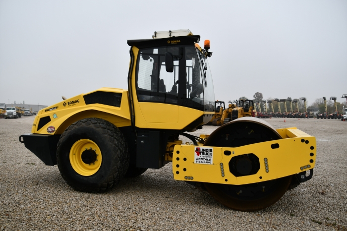 RENTAL UNIT ONLY - CALL FOR RENTAL RATES. 83.9" Vibratory smooth drum compactor, cab, A/C, Deutz TCD3.6L4 T4f 128 HP diesel, 23.1-26 tires, variable frequency 1800/2040 VPM hydrostat drive, 64,071/44,063 centrifugal force, 27,580 lbs. (Stock #11549)