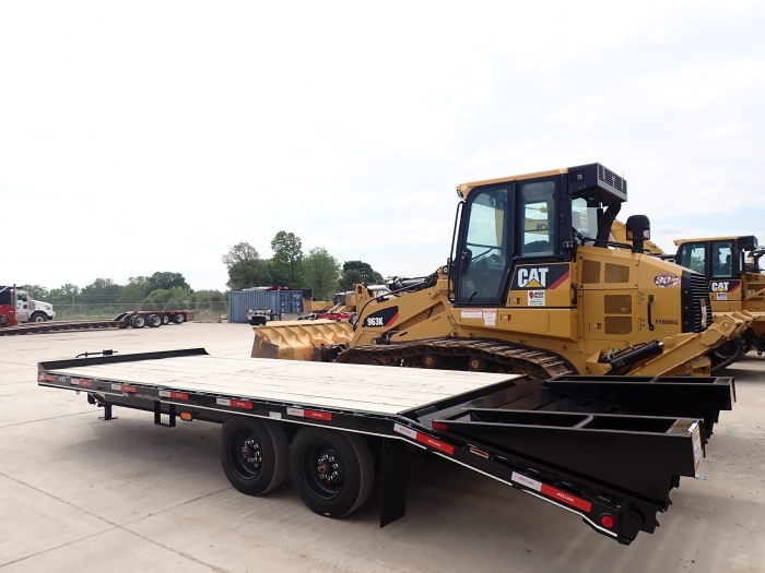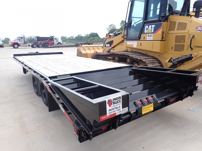 RENTAL UNIT ONLY - CALL FOR RENTAL RATES. 18,400 GVWR, 12,200 lb. capacity, 102" wide deck over, 18' long deck, 5' self cleaning beaver, 5' self cleaning ramps, 8,000 lbs. torsion axles, 215/75R17.5 tires, oak 2' deck, rub rail, LED lights, battery, pintle eye, tool box. (Stock #FEL014)