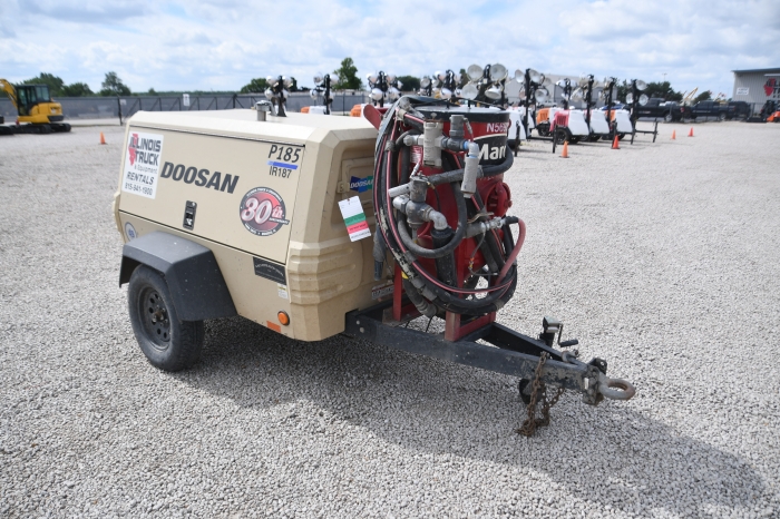 RENTAL UNIT ONLY - CALL FOR RENTAL RATES. Doosan D24NAP 49HP Tier 4f diesel, 185 CFM, 100 psi, 05/75/D15 tires, pintle hook, 27 gallon fuel tank, 10 hr. run time, 2,450 lbs. (Stock #IR187)