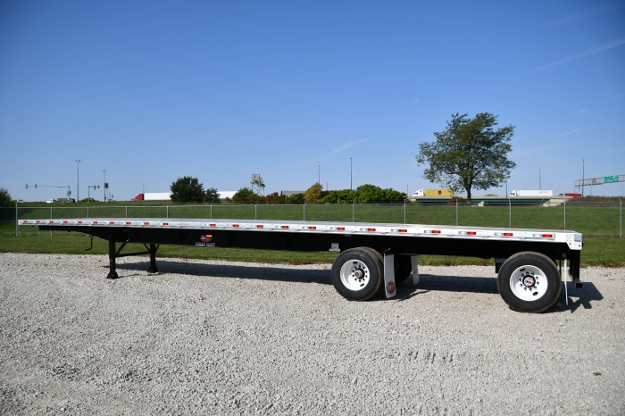 RENTAL UNIT ONLY - CALL FOR RENTAL RATES. 48' Flat, 80,000 GVRW, 122" Spread axle, Air Ride, 295/75R22.5 Tires, 30" Fixed King Pin, 55" ride height, Extruded Aluminum Rub Rail, Winch Track w/12 Sliding Winches, Coil Package, Dump Valve Wired to Front, Nailer Boards, Recessed Chain Ties. (Stock #N6633)