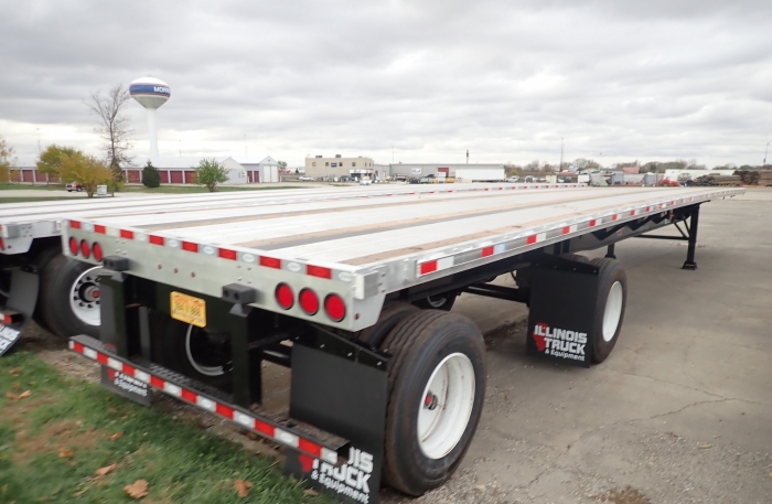 RENTAL UNIT ONLY - CALL FOR RENTAL RATES. 48' Flat, 80,000 GVRW, 122" Spread axle, Air Ride, 295/75R22.5 Tires, 30" Fixed King Pin, 55" ride height, Extruded Aluminum deck with 4 wooden insert boards, Extruded Aluminum Rub Rail, Winch Track w/12 Sliding Winches, Coil Package, Dump Valve Wired to Front, Nailer Boards, Recessed Chain Ties (Stock #N6637)