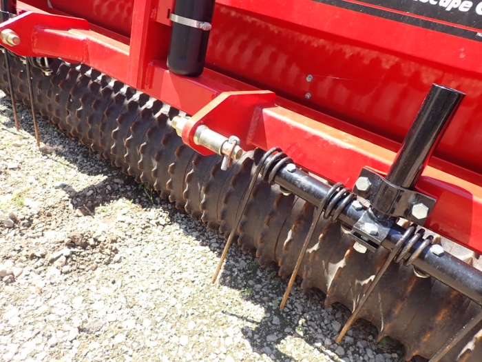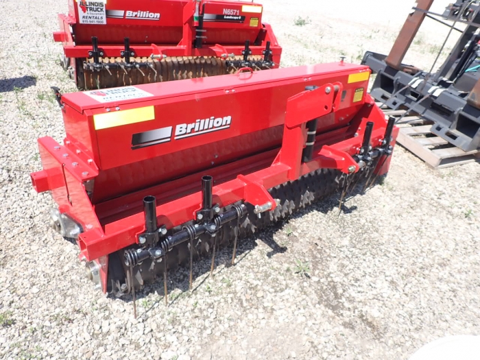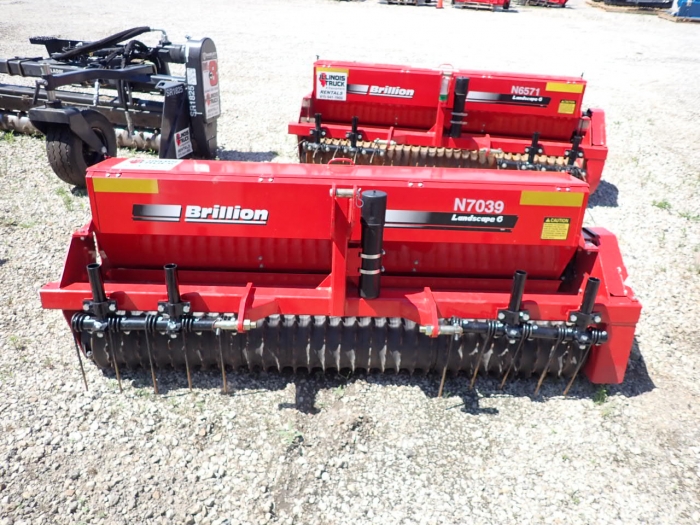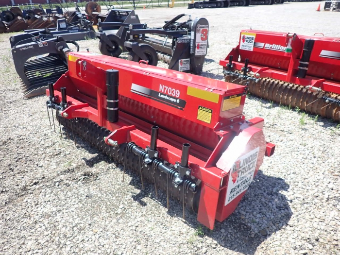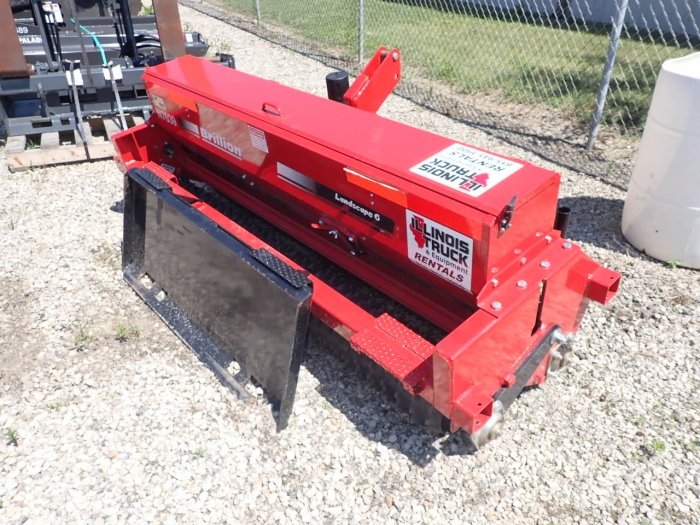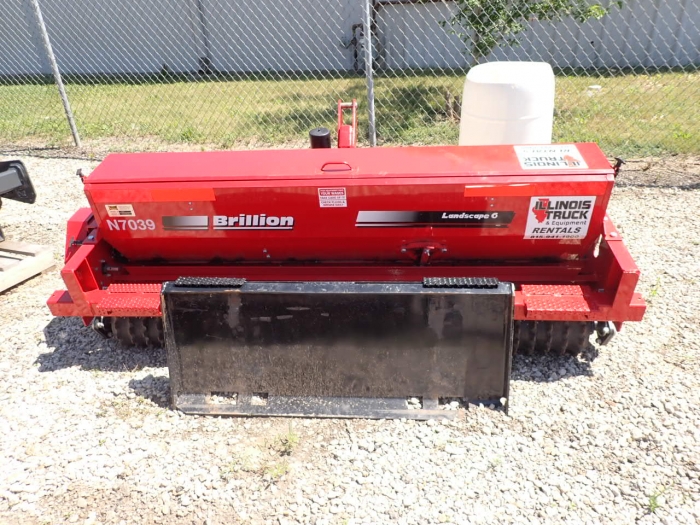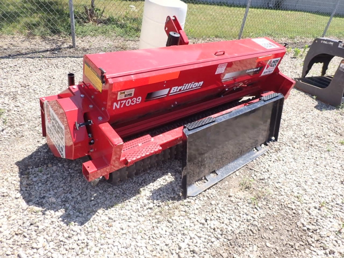 6' working width, universal skid loader mount and cat. 1 or 2 3 pt. mount, 4.5 bushel hopper, front and rear pulverizes, ground driven, 3-5 mph working speed, 35HP recommend, 7' transport width, 1,242 lbs. (Stock #N7039)